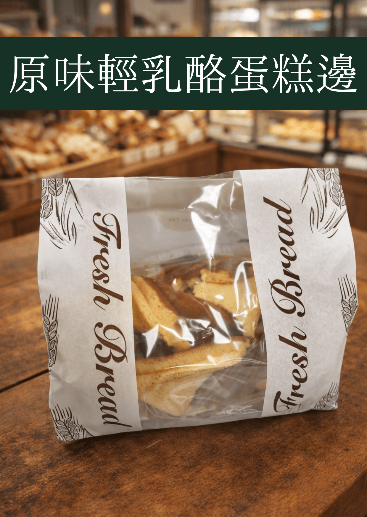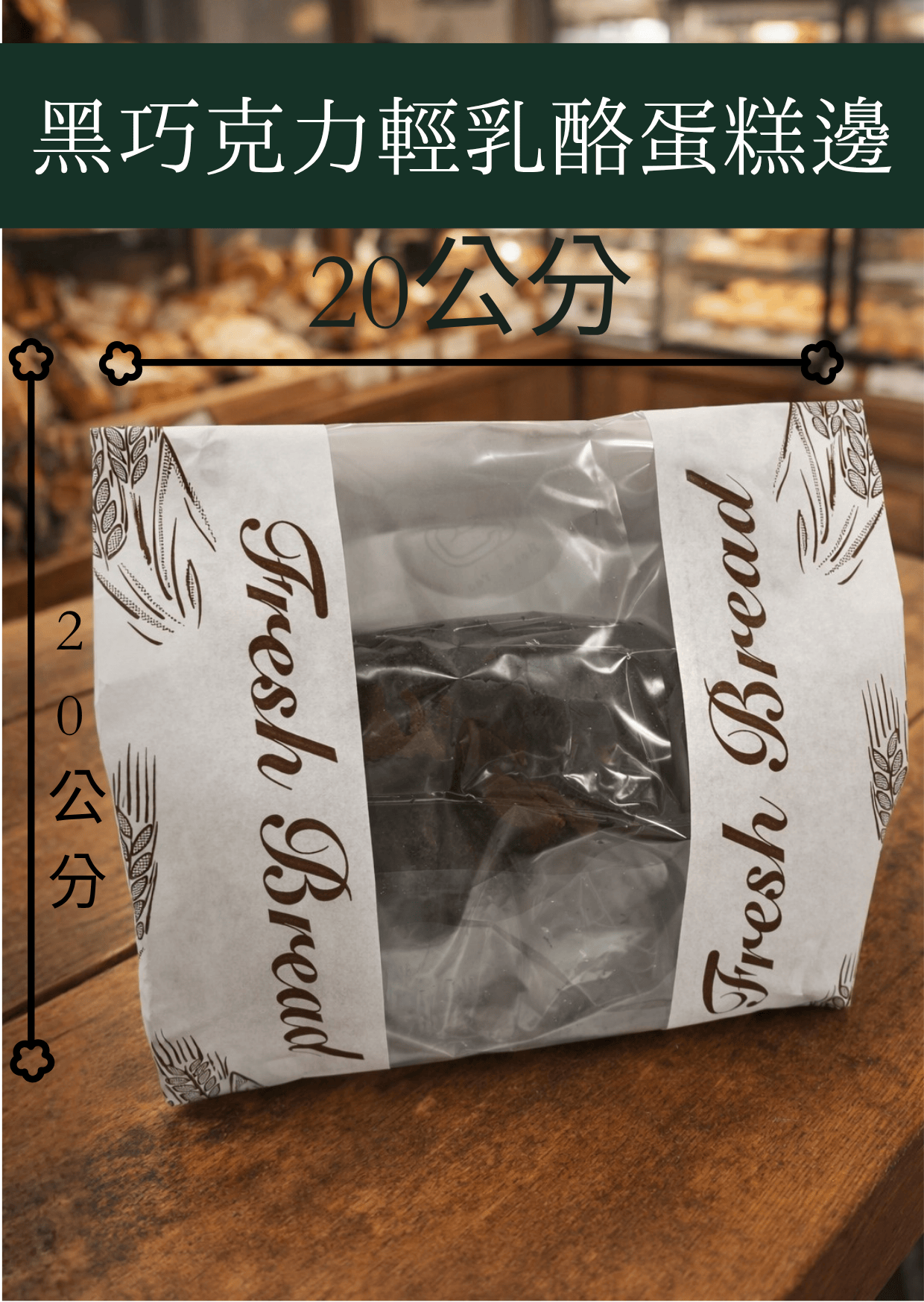 商品詳情 輕乳酪蛋糕體製作的蛋糕邊 一包重量約 350g 左右 長20寬20 厚度9內包裝為塑膠袋 外包裝的紙袋會另外提供! 一箱為15包 口味有 巧克力,黑巧克力,原味,抹茶 四種口味!保存期限:庫存 冷凍可以2個月 販售建議直接放常溫販售 當天可不冰冷藏三天 輕乳酪蛋糕切邊